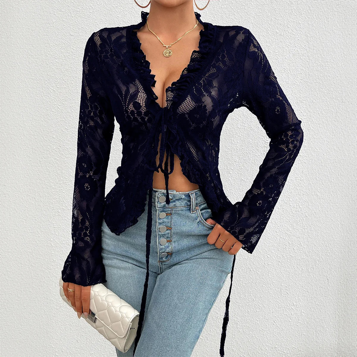 Women's Fashion Designer S-XL Lace Flared Long-Sleeve Tops