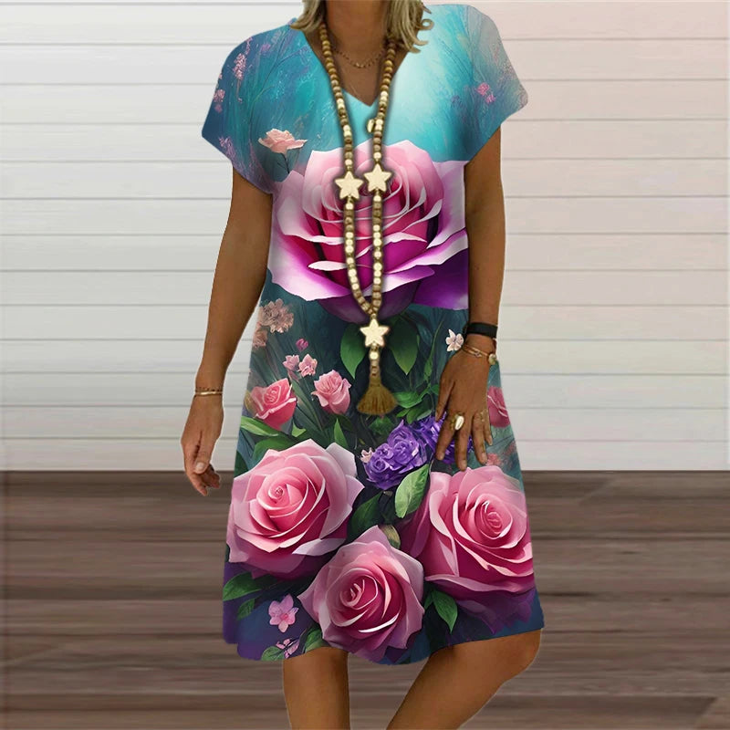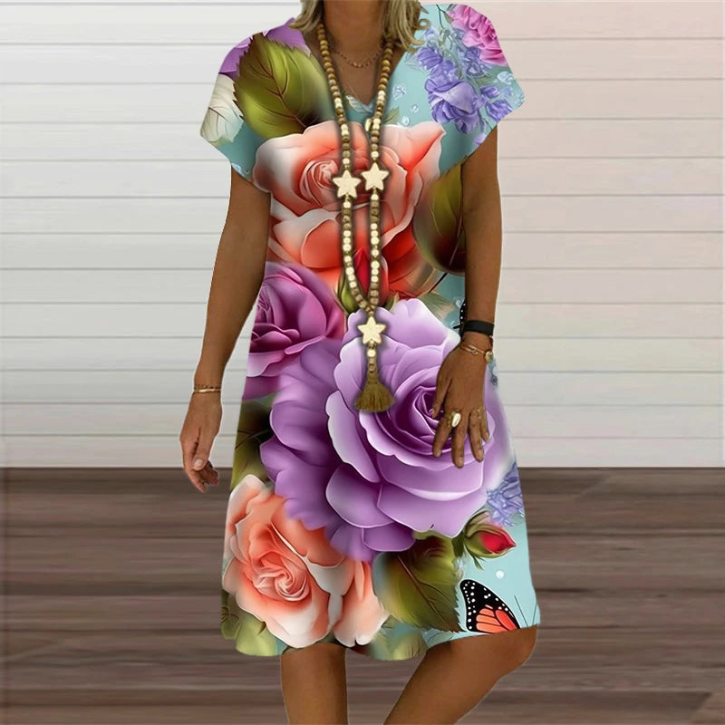 Women's 3D Flower Print A-Line 1-5XL Fashion Designer Mini Short Dresses (Plus Size)