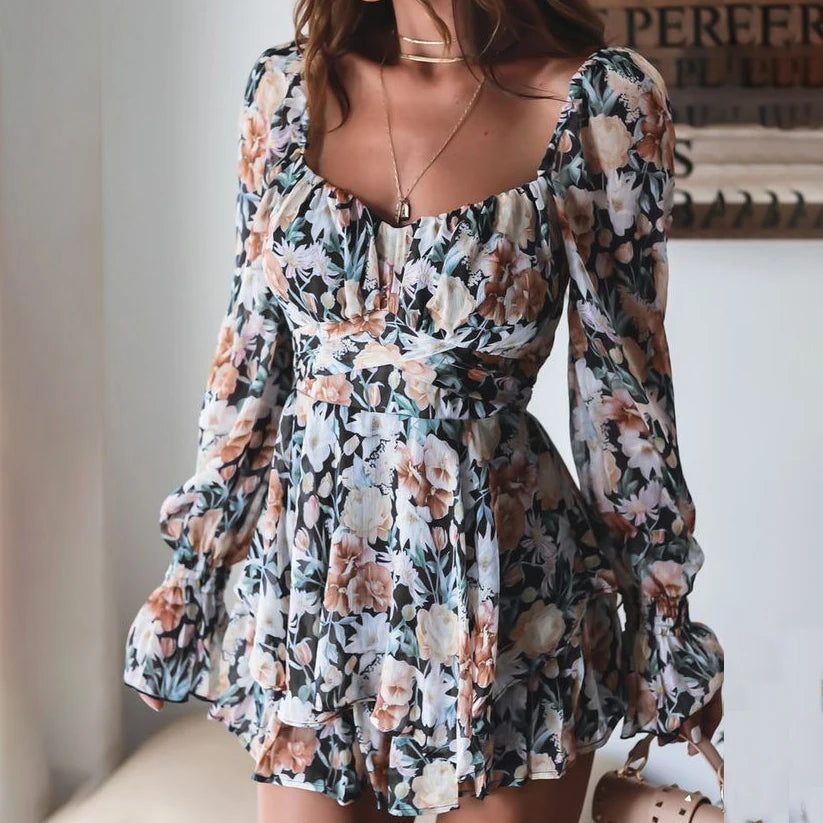 Style 2: Long Sleeves Lace Up Ruffle Floral Print Romper Female Playsuit
