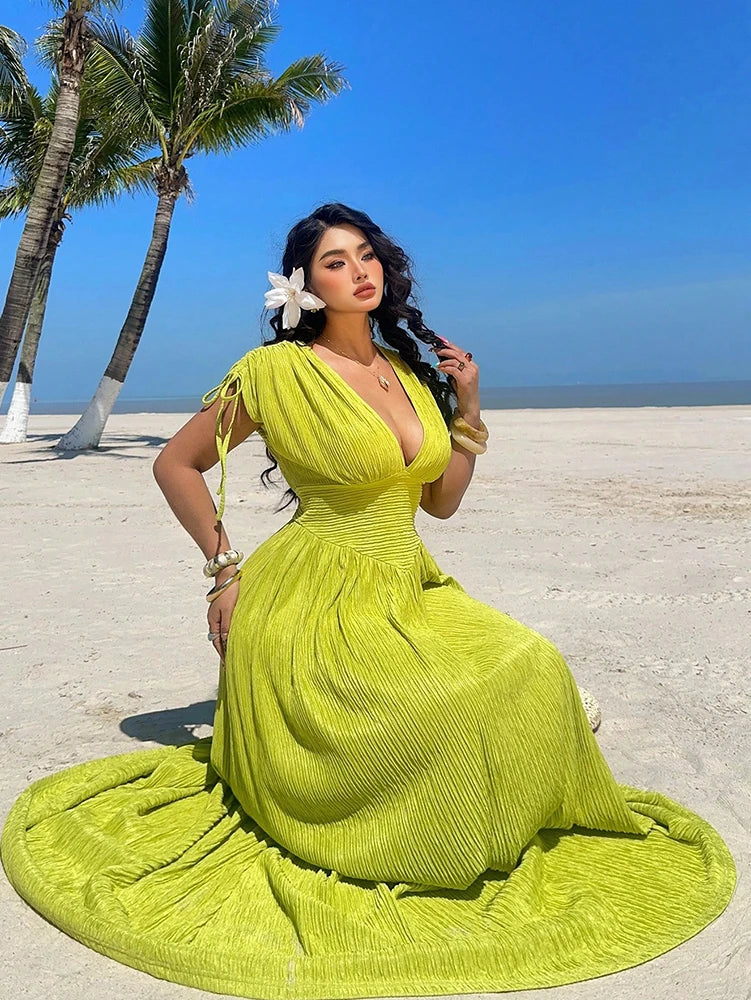 Women's Drawstring Shoulder 1-5XL V-neck Fashion Designer Long Dresses (Plus Size)