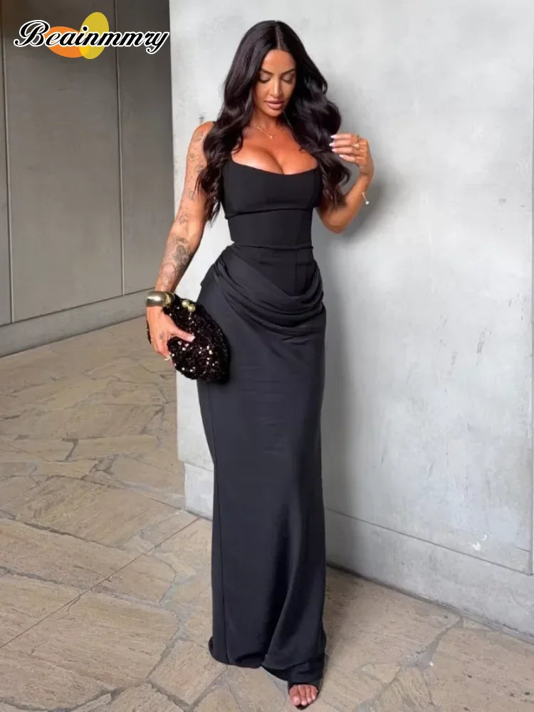 3: Fashion Pleated Sling Maxi Dress Women Elegant Solid Sleeveless Square